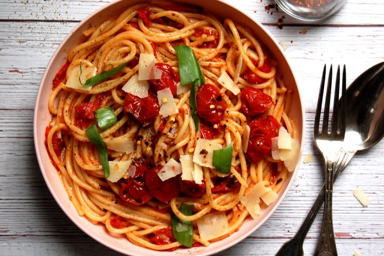 Fresh pasta pomodoro that’s a breeze to pull off in the oven and tastes amazing. Fresh grape tomatoes get roasted until jammy with onion and olive oil. Add pasta, stir, and serve. Your new favorite pasta.