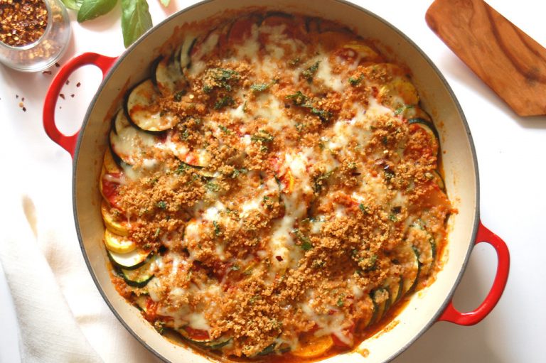 One of summer’s most satisfying recipes: summer squash layered over marinara and onion, topped with breadcrumbs and mozzarella and roasted for an easy, one-pan dish.