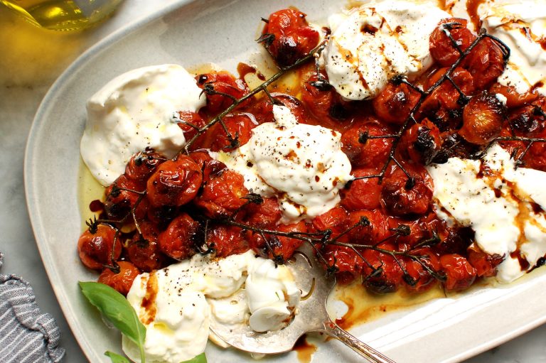 A little indulgent and a lot unfussy. Here’s the recipe for burrata with jammy roasted on-the-vine cherry tomatoes. A perfect, chic, effortless appetizer.
