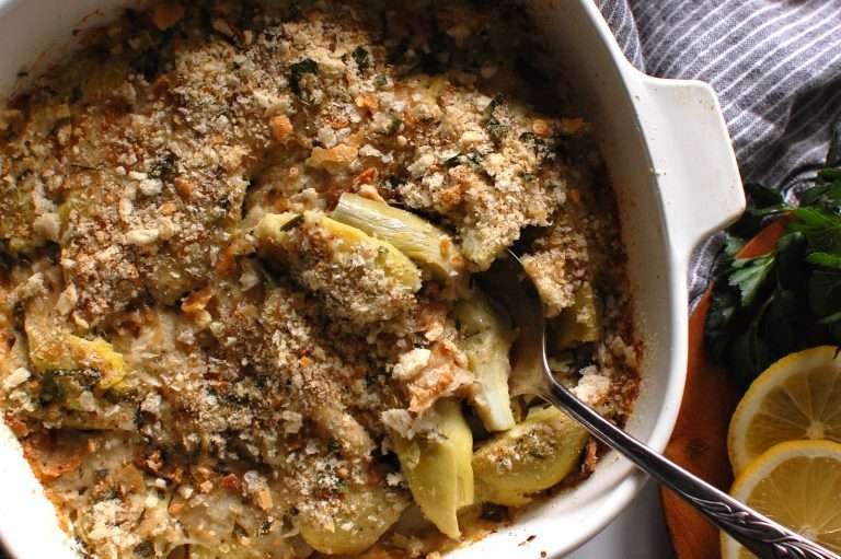 Simple frozen artichoke hearts, transformed into a fabulous baked Italian artichoke casserole recipe with well-seasoned breadcrumbs and cheese.